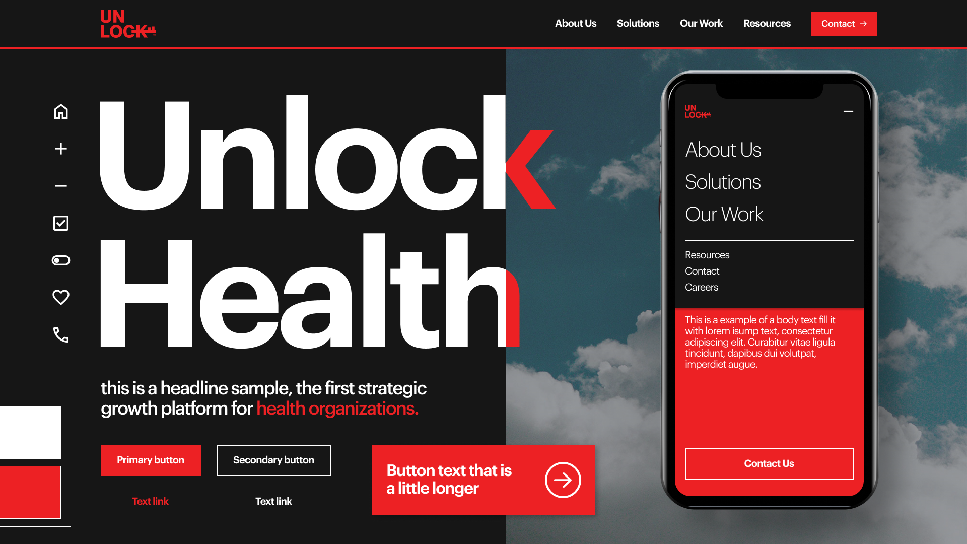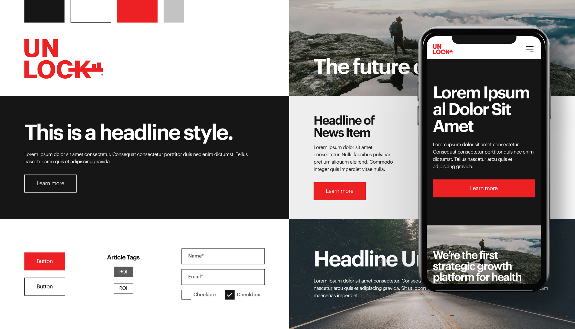 With a solid UX foundation, we translated insights into a cohesive component-based design system that balanced flexibility and consistency. Using style tiles, we explored typography, color schemes, and visual elements to shift the brand toward a lighter, more inviting aesthetic. The redesign addressed previous concerns about the dark, unapproachable brand identity by refining layouts and visual hierarchy. Through iterative prototyping and structured design decisions, the final design successfully unified Unlock Health’s diverse business lines into a seamless and professional digital experience.